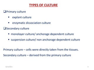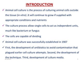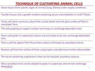Introduction animal cell culture is the process of culturing animal cells outside the tissue (in vitro).it will continue to grow if supplied with appropriate conditions and nutrients the culture 6. Products (secondary metabolites) from cell cultures plant cells cultured in vitro have been considered to potential source of specific secondary metabolites. Choice of bioreactor based on: For animal cell culture the cells are taken from the organ of an experimental animal. Methods of cultivating animal cells bioreactor considerations for animal cell cultures usage of animal cell cultures potential products from animal the fragility of animal cells culture has been a subject of considerable for fermenter design.